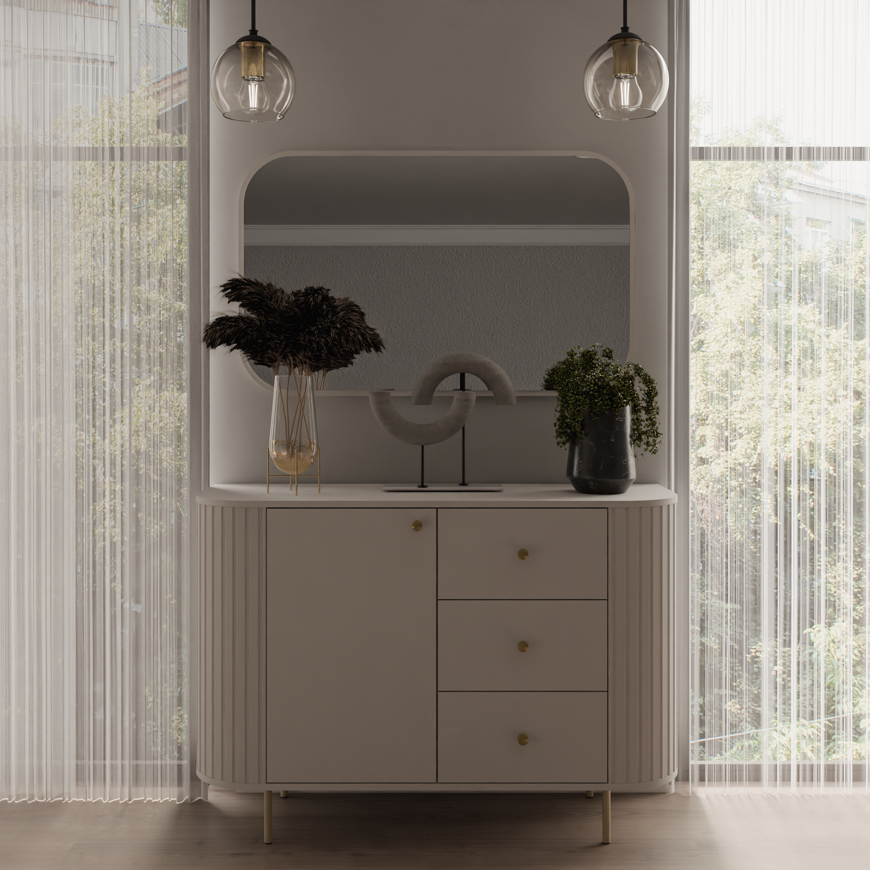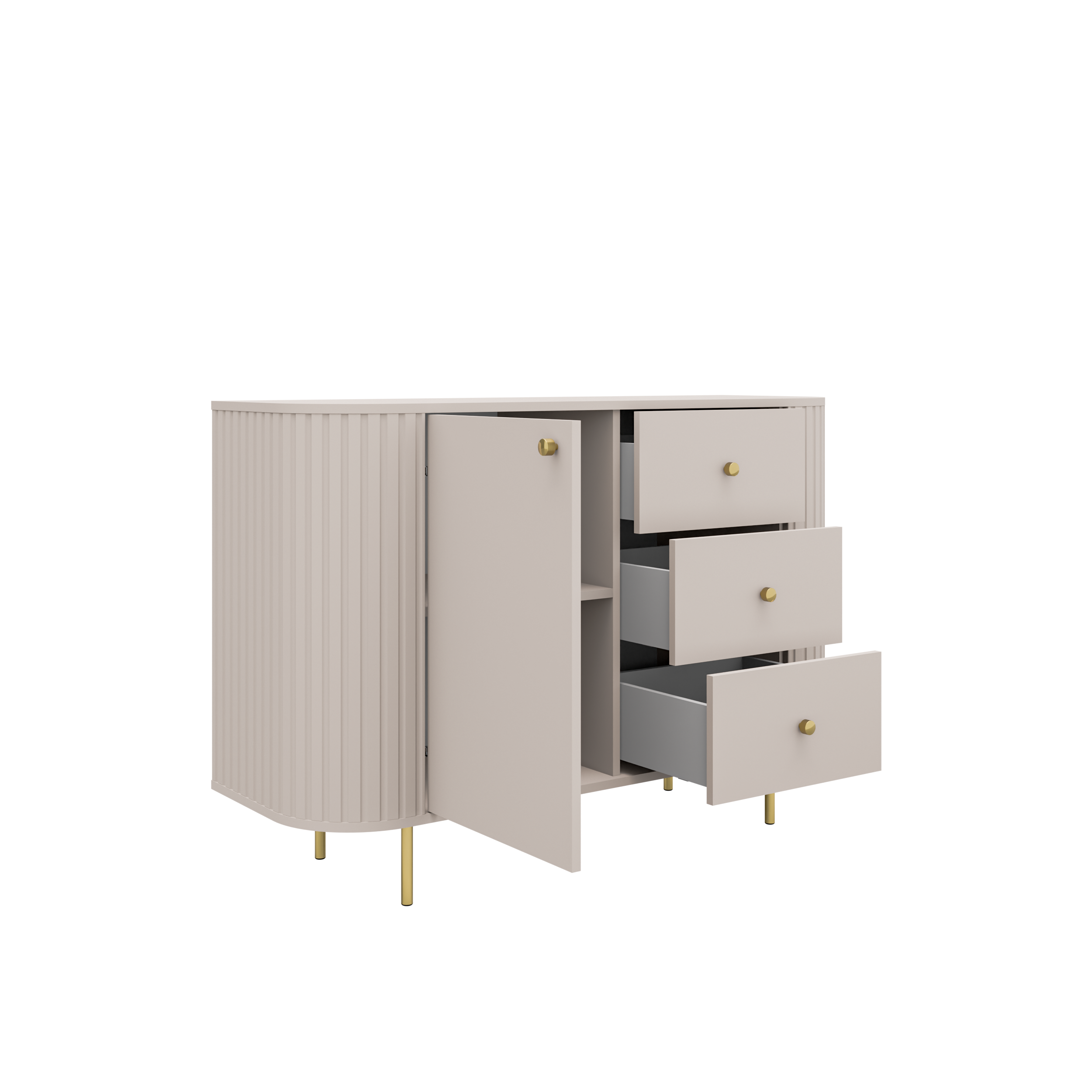 Beż Piaskowy nadaje całości lekkości i subtelnej elegancji, a zaokrąglone boki z delikatnym ryflowaniem łagodzą formę mebla. Jedna zamykana szafka oraz trzy szuflady pozwalają wygodnie przechowywać wszystko, co chcesz mieć pod ręką, ale poza widokiem. Czarne metalowe nogi i czarne gałki tworzą wyraźny, nowoczesny kontrast.