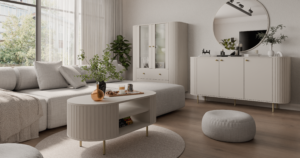 Prosta forma, jasny kolor i spokojny charakter. Komoda Ovalio 1F 3S w kolorze Beż Piaskowy to mebel, który naturalnie rozjaśnia wnętrze i porządkuje przestrzeń bez efektu ciężkiej bryły.