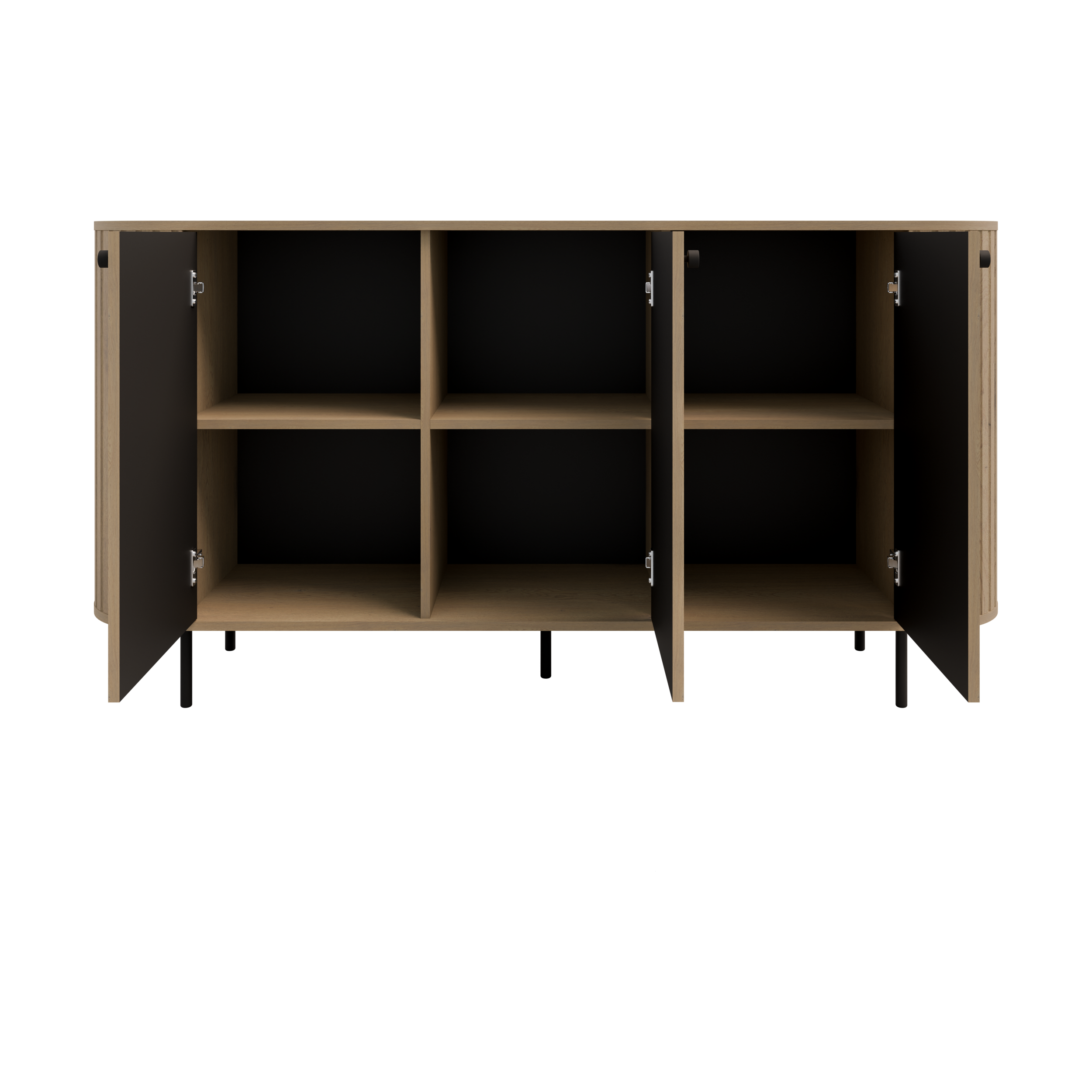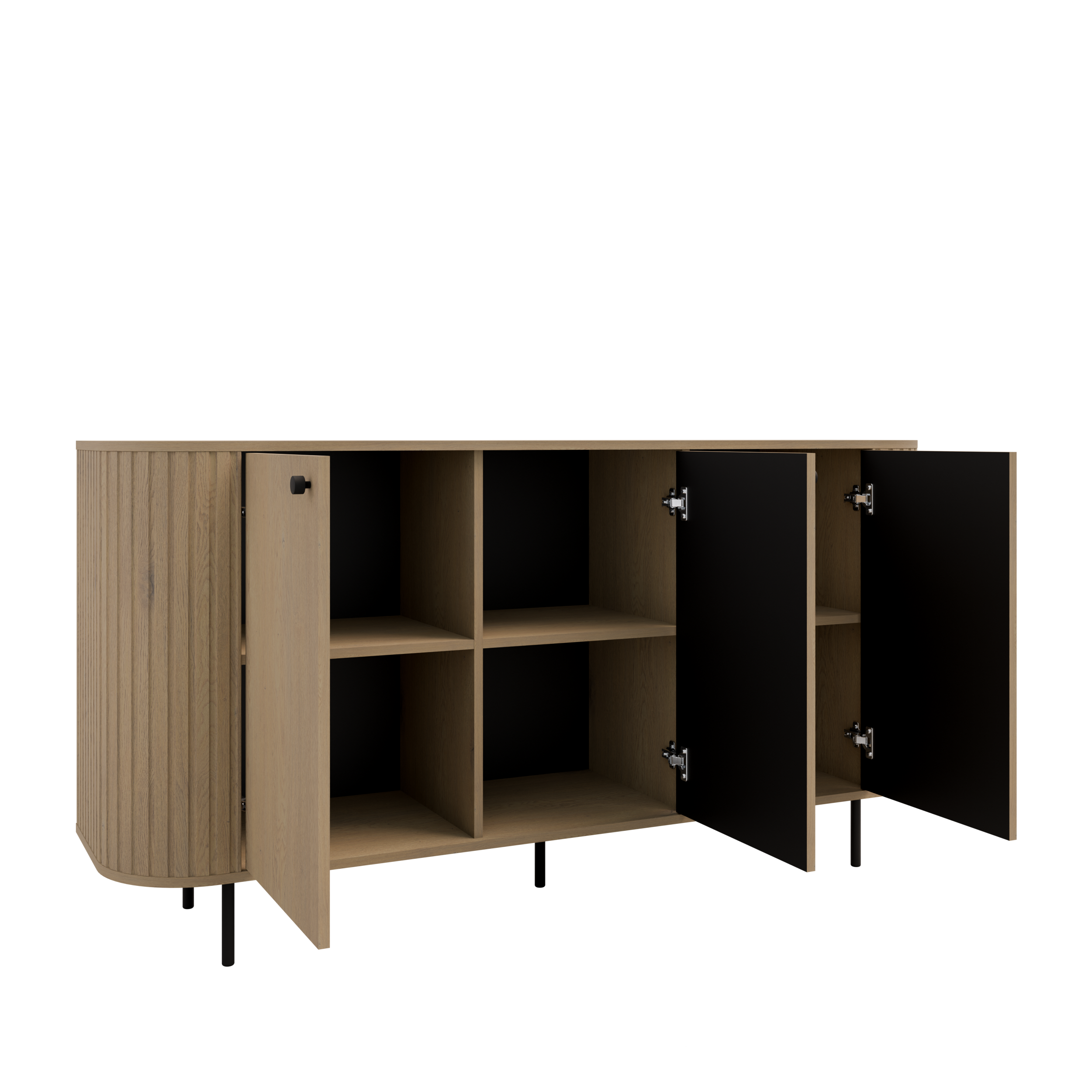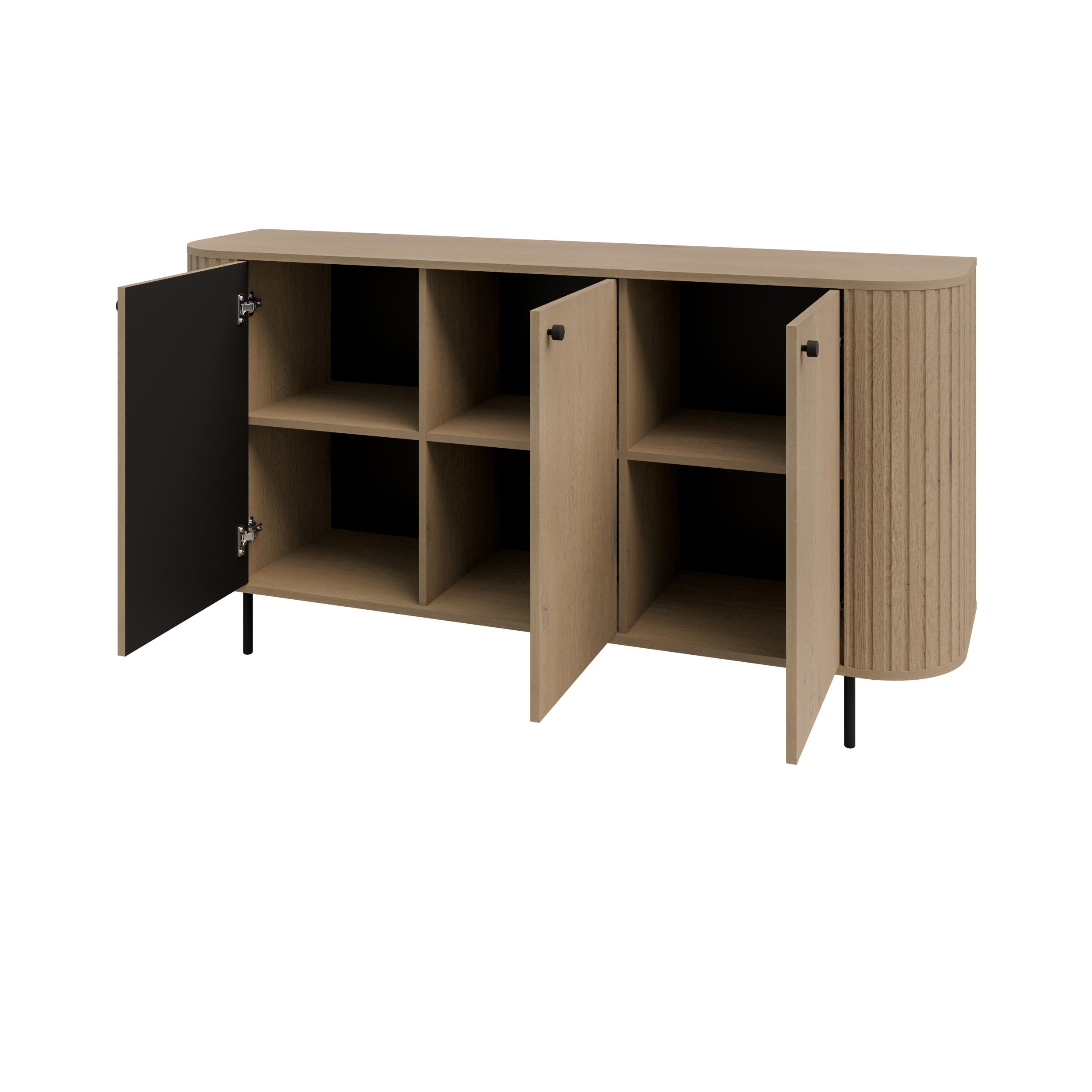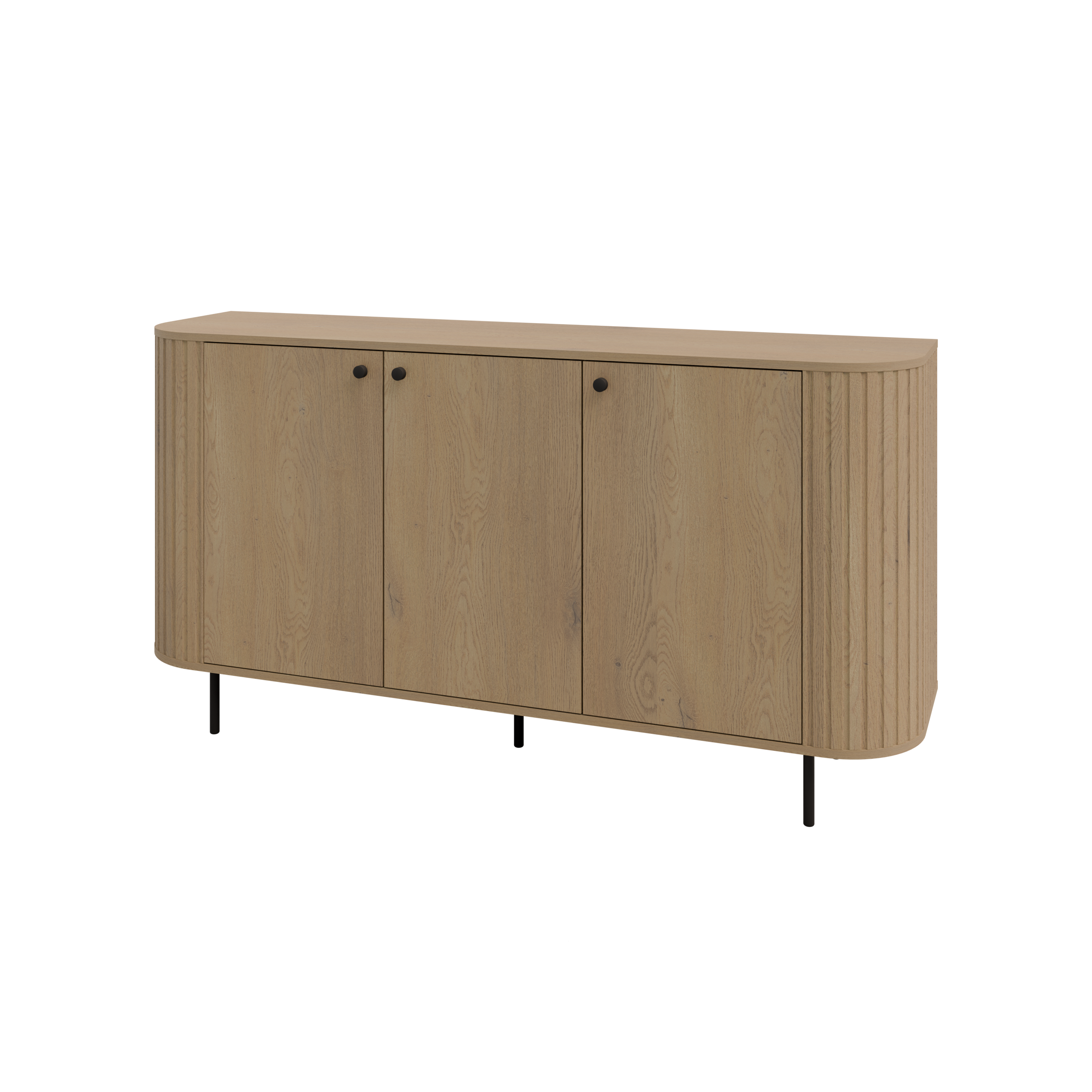 Ciepły odcień Dębu Cremona ociepla wnętrze, a zaokrąglone boki z delikatnym ryflowaniem nadają bryle lekkości. Trzy zamykane fronty tworzą uporządkowaną, pojemną przestrzeń do przechowywania. Czarne metalowe nogi unoszą mebel optycznie, a czarne gałki subtelnie podkreślają linię frontów.