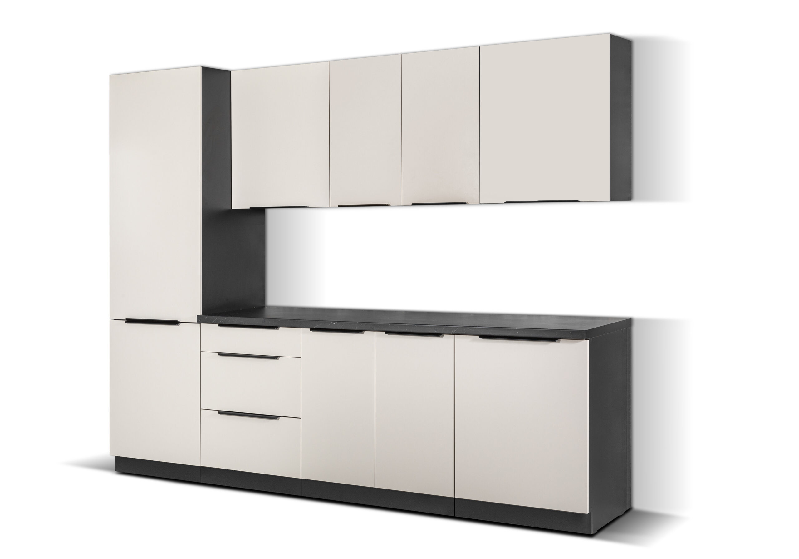 Zestaw mebli kuchennych ARONA w kolorze Kaszmir to elegancka i nowoczesna propozycja do każdej kuchni. Jasne fronty w ciepłym, modnym odcieniu kaszmiru w połączeniu z czarnym korpusem tworzą spójną i stylową zabudowę, która dobrze prezentuje się zarówno w nowoczesnych, jak i bardziej klasycznych wnętrzach.